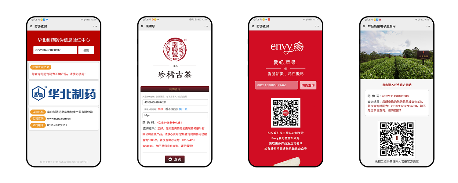《時匆防偽物聯(lián)網信息查詢系統(tǒng)》是全國少有的通過國家質檢總局防偽技術評審認證的防偽系統(tǒng)之一,綜合運用了計算機技術、數據庫技術、加密技術、印刷技術、通信網絡技術、語音轉換技術等,利用INTERNET、400電話、短信以及掃碼平臺端等方式,通過數據庫存取技術將這些信息和數據庫進行對比并將處理結果傳遞給客戶,提供商品真?zhèn)蔚南嚓P信息,并可實時追蹤來電號碼或IP地址、日期、時間、查詢內容、查詢結果等,并且自動生成報表,供企業(yè)查看分析。