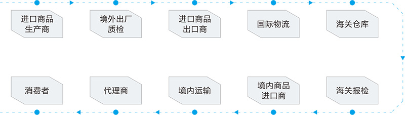 從國外生產企業認證追蹤,產品報關單,運輸,靠岸,流通認證,經手人記錄,運輸等過程掃碼記錄,下線代理商管控記錄,為進口商品企業提供整體解決方案。
